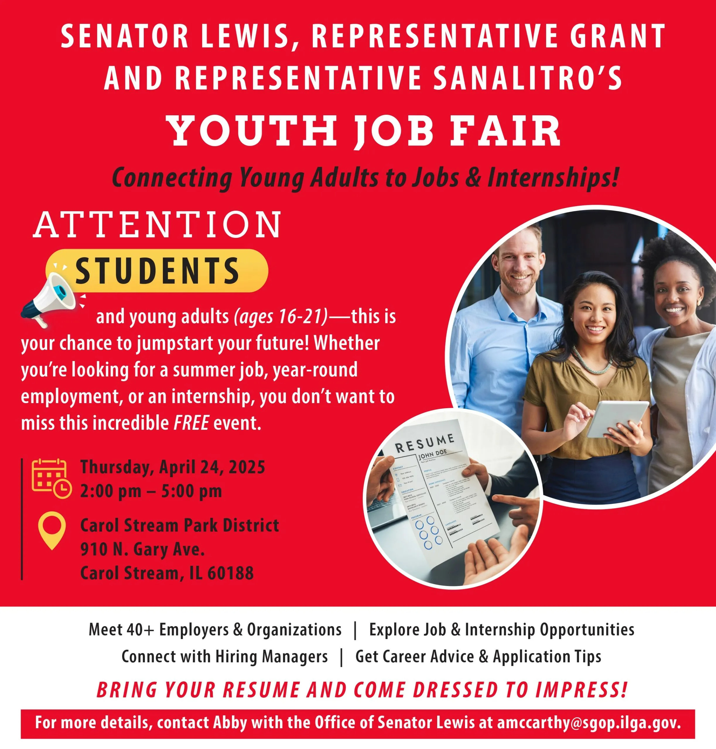 Students and young adults aged 16-21 who want to jumpstart their careers or find summer work and internships are invited to attend a free Summer Job Fair that will be hosted by State Senator Seth Lewis (R-Bartlett) on April 24 in Carol Stream. State Representatives Amy Grant (R-Wheaton) and Jennifer Sanalitro (R-Hanover Park) are co-hosting the event.