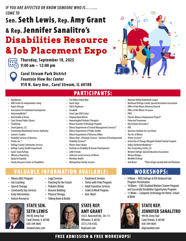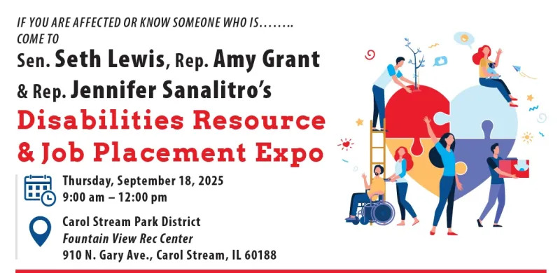 CAROL STREAM, IL – State Representative Amy Grant (R-Wheaton), State Representative Jennifer Sanalitro (R-Hanover Park), and State Senator Seth Lewis (R-Bartlett) are hosting a Disability Resource Fair to help connect…