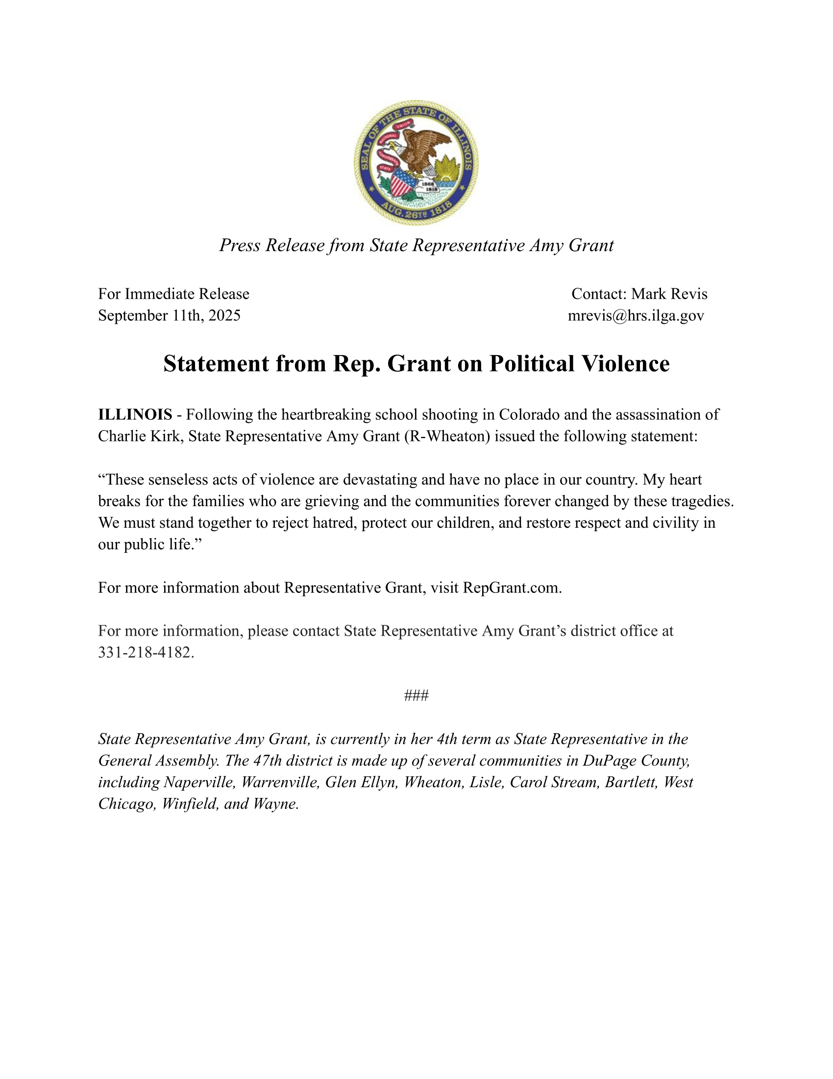ILLINOIS – Following the heartbreaking school shooting in Colorado and the assassination of Charlie Kirk, State Representative Amy Grant (R-Wheaton) issued the following statement: “These senseless acts of violence are…