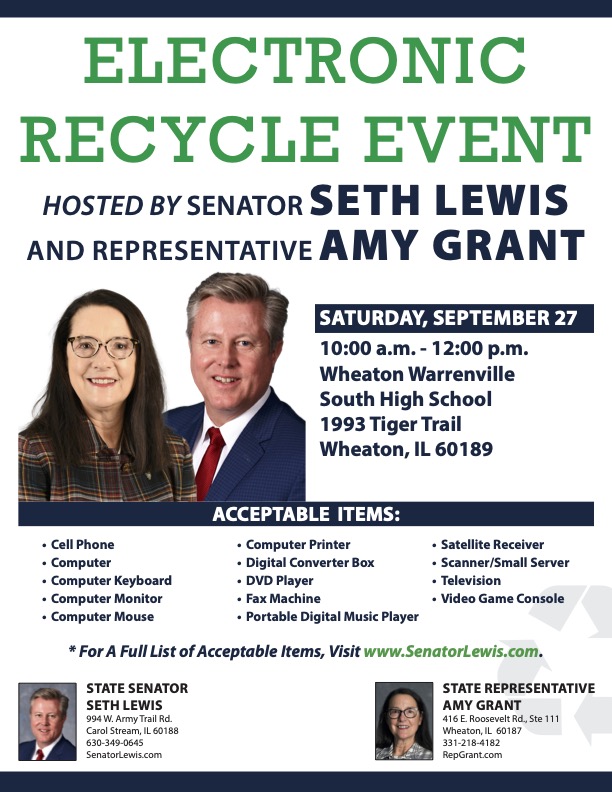 WHEATON, IL – State Representative Amy Grant and State Senator Seth Lewis are inviting local residents to a FREE Electronics Recycling Event on Saturday, September 27 at Wheaton Warrenville South…