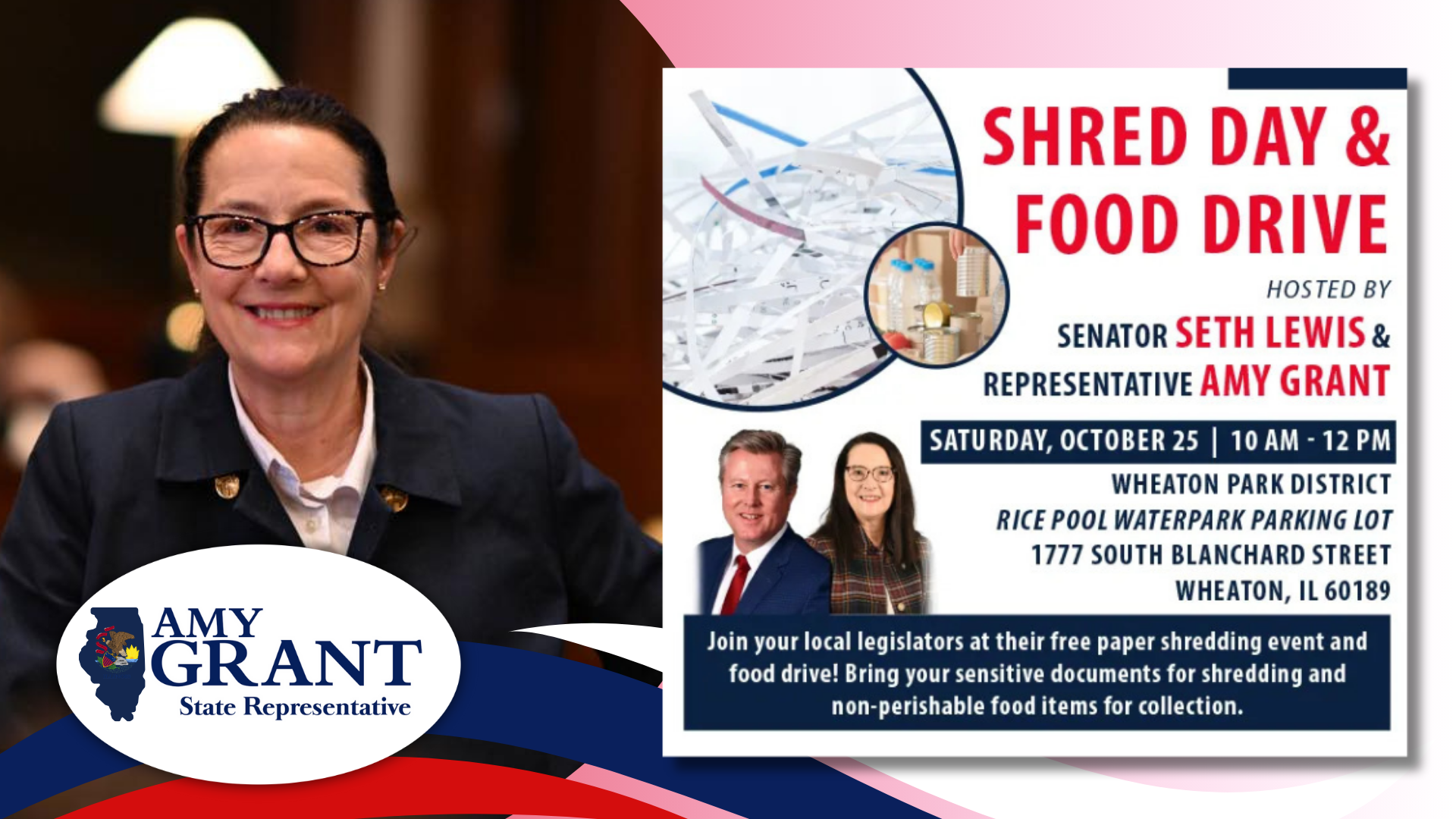 WHEATON, IL – State Representative Amy Grant (R-Wheaton) and State Senator Seth Lewis (R-Bartlett) are partnering to host a FREE Community Shred Event and Food Drive on Saturday, October 25th,…