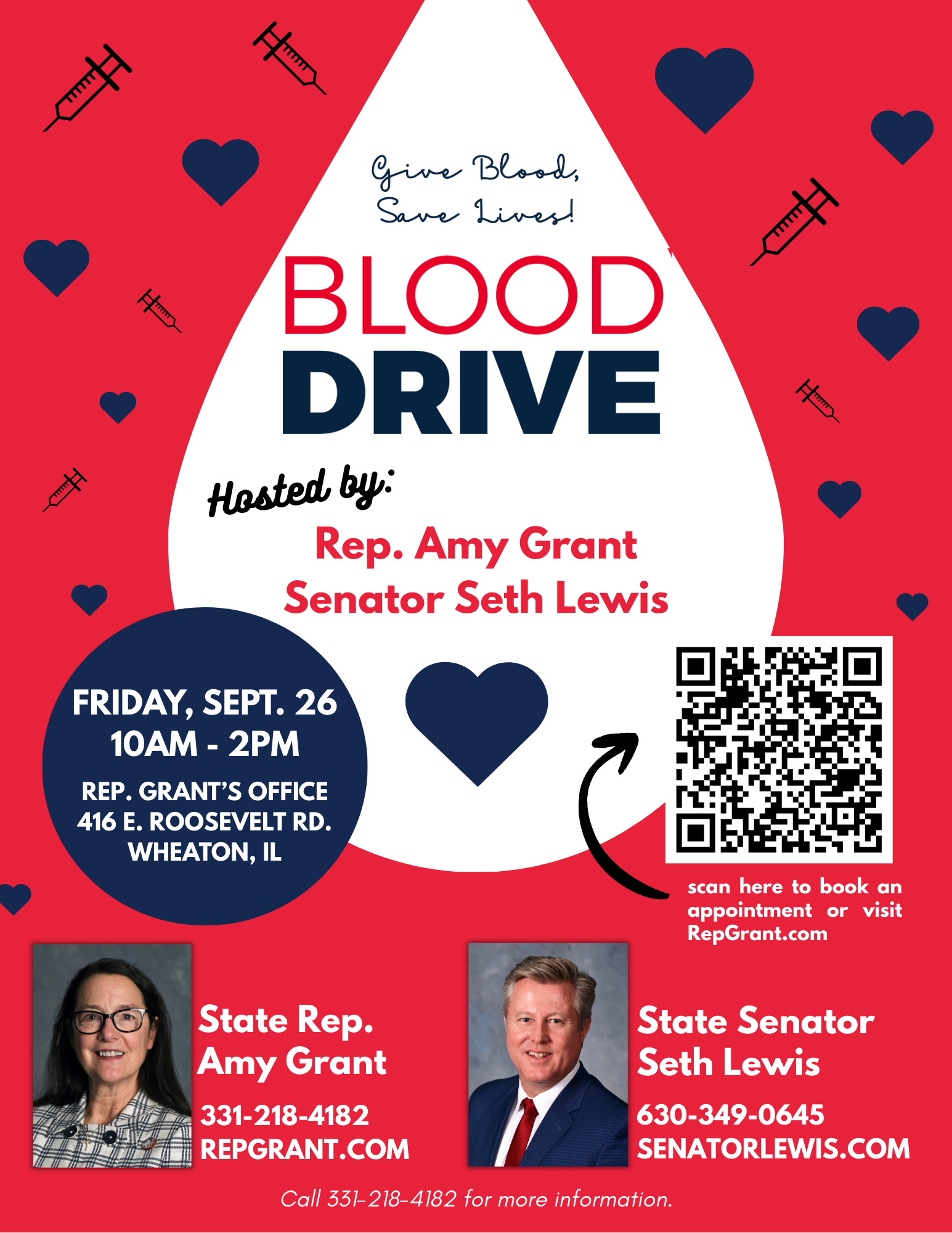 WHEATON – State Representative Amy Grant (R-Wheaton), in partnership with State Senator Seth Lewis (R-Bartlett), is inviting residents to take part in a Community Blood Drive on Friday, September 26,…